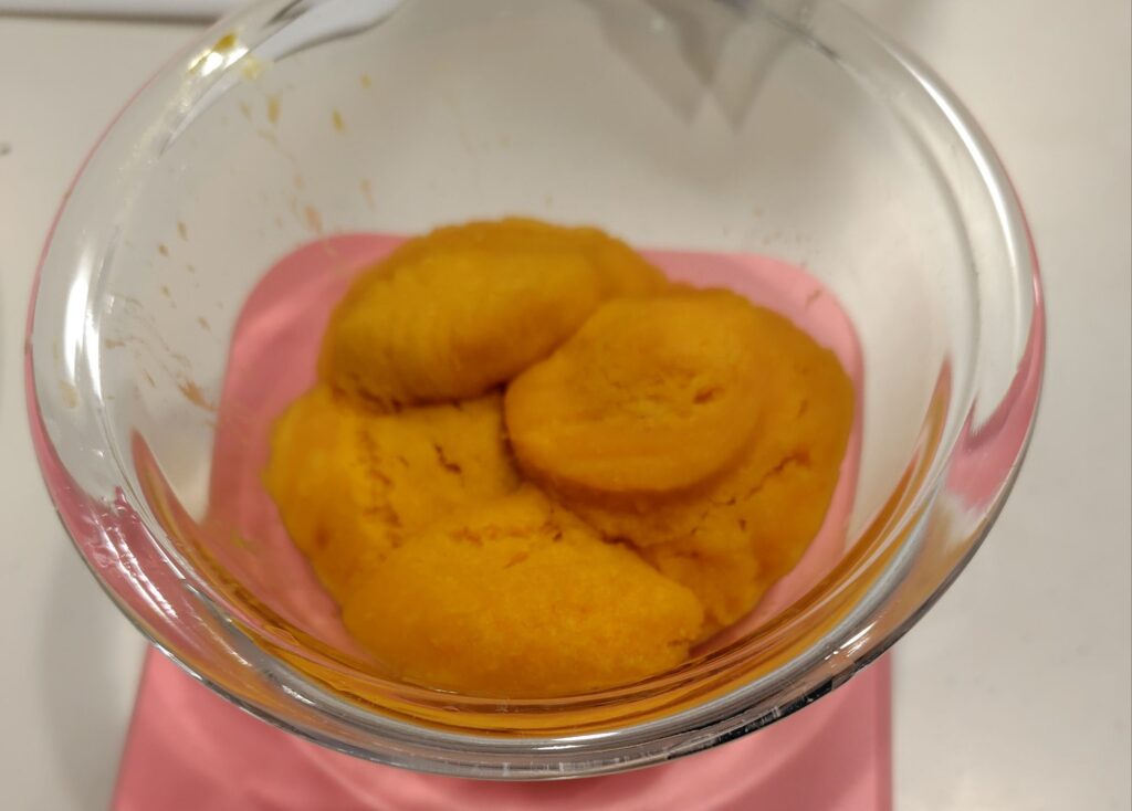 ①冷凍のかぼちゃ裏ごしをパッケージ裏面の規定時間レンジで加熱